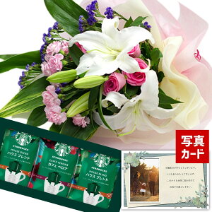 あすつく。送料無料。画像配信有。 当店人気のバラブーケをスターバックスコーヒーセットと共にお届けします。 アレンジメントはピンク系、イエロー系、レッド系、ミックス 4色からお選びいただけます。 【商品サイズ】 バラブーケ…高