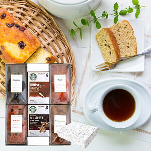 ※スターバックスコーヒー(種類・味は当店おまかせ)が必ず2個入ります。(夏季限定でアイスコーヒーが入ることも!?) パウンドケーキ4個はお好みの種類・味をお選び下さい。●箱サイズ/約360×290×80mm●商品内容/パウンドケーキ(...