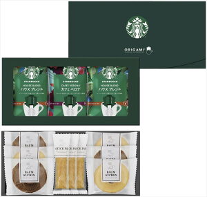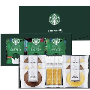 【商品名】 スターバックスコーヒー&スイーツギフト 【内容】スターバックスオリガミドリップコーヒー ハウスブレンド 9g ・バウムクーヘン ココア・バニラ ・スティックパイ プレーン ×各3、スターバックスオリガミドリップコーヒー ...