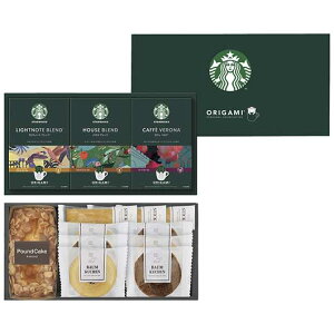 ●セット内容:スターバックスオリガミドリップコーヒー(ハウスブレンド9g×4・カフェベロナ9g×4・ライトノートブレンド9g×4)、バウムクーヘン(ココア・バニラ)×各3、スティックパイ(プレーン)×3、アーモンドバウンドケーキ●箱サ