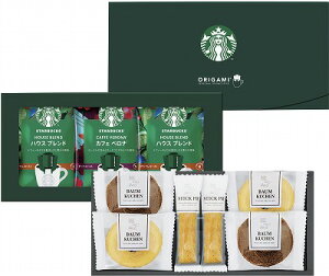 ●商品内容:スターバックスオリガミドリップコーヒー(ハウスブレンド×3・カフェベロナ×2)各9g、バウムクーヘン(ココア・バニラ)各2、スティックパイ(プレーン)×2 【卵・乳成分・小麦】 ●賞味期間(製造日から):120日間●生産