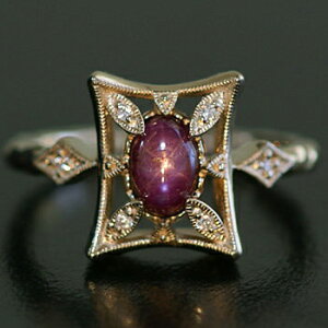 リング 【 仕様 】 ■本体素材[1]K18ホワイトゴールド製(サンプル=本体) [2]スターサファイア・オーバルカボション(約)7×5mm×1石 [3]ローズカットダイヤモンド(約)1.45mm×1石...