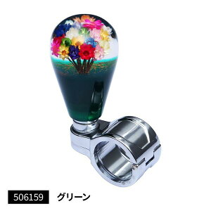 ハンドルスピンナー 水中花 〜花増量タイプ グリーン 「水中花シリーズ」のハンドルスピンナーが、花を増量させて豪華になりました。 シフトノブと合わせて統一感アップ!! 車庫入れや縦列駐車の切り返しなどが容易になるよう内部に