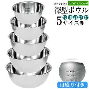27cm各1個の5サイズセットです。 ●重ねてコンパクトにスッキリ収納できます。 ●中の食材がこぼれにくく混ぜやすい深型タイプ! ●便利なメモリ付き