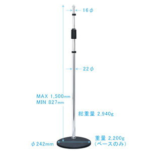 コストパフォーマンスに優れた人気のストレートマイクスタンド。 カラー:ブラック 高さ:850mm〜1,550mm シャフト太さ:φ16mm/φ23mm 脚部シャフト太さ:φ19mm マイクホルダー接続部:3/8インチ...