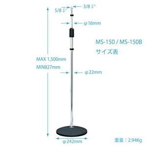 ストレート・タイプ・マイクスタンド カラー:BK/ブラック 高さ:850mm〜1,550mm シャフト太さ:φ16mm/φ23mm 脚部シャフト太さ:φ19mm マイクホルダー接続部:3/8インチ 折畳み寺全長:約78.5cm...