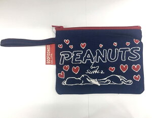 ハートにあふれた寝そべるスヌーピーの愛らしいワンシーンを刺繍で描いたポーチです。汚れが目立ちにくいネイビーのキャンバス地に赤と白が映えるラブリーなデザインです。内ポケットが付いていて使いやすく、マチなしなのでBAGに入れ