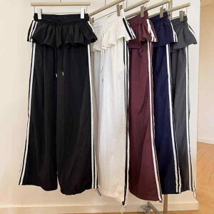 パンツ レディース 韓国風 スポーツ ウェア 裾フリル 切り替え ドローストリング ナイロン 混紡 カジュアル パンツ 白 ホワイト グレー 黒 ブラック 紺 ネイビー 赤 レッド 高腰 ストレート 無地...