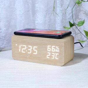ナチュラルなデザインがどんなインテリアに馴染む・木目調デジタル時計 Qi対応で楽々充電機能付き・ケースをしたままでも充電できちゃう優れもの? リビングに1台置いておくだけで時刻・温度も見れてサッと充電できて日々の生活が快適に