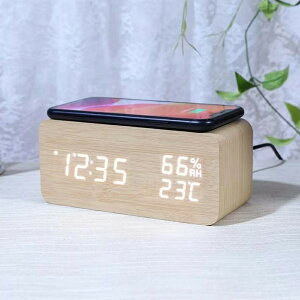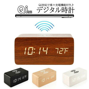 ナチュラルなデザインがどんなインテリアに馴染む♪木目調デジタル時計 Qi対応で楽々充電機能付き♪ケースをしたままでも充電できちゃう優れもの♪ リビングに1台置いておくだけで時刻・温度も見れてサッと充電できて日々の生活が快適