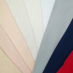 定番21色カラー無地の綿ジャージースムースニット生地 普通地のTシャツくらいの厚さで程よい伸縮性があります。 コットン100%で柔らかく、なめらかな肌触りなので、ベビー、キッズのお洋服にはもちろん、大人のカットソーにもおすすめで
