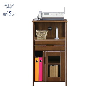 幅45cmのスリムなコンパクトサイズ電話台、ファックス台。ルーター等の電子機器を設置するのに便利なコード通し穴あり。小物の収納に便利な引き出し収納あり。開き扉収納。棚板取り外し可能。