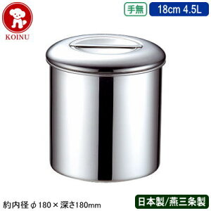 サイズ:Φ180×高さ180mm容量:4.5リットル材質:18-8ステンレス●引っ掛け金具付(蓋を本体に引っ掛けられます。)