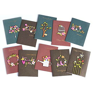 ◆商品名:moin moin メッセージ カード + 中紙 + 封筒 10種セット | サンキュー ありがとう 誕生日バースデー グリーディング | 立体 3D 箔押し ゴールド | 木 森 花 フラ...