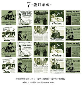 ◆平日16時迄のお支払いは当日出荷(土日祝を除く) 海外コラージュ素材、ヴィンテージ デザインペーパー 落ち着いた独特な色合い、レトロ 風なデザインが素敵 異なる2種類紙質入り、楽しさが倍増! ※20枚 硫酸紙(透ける、書ける) ※20枚