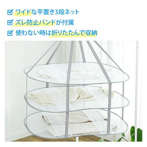 セーター、ニット等変形させたくないものを、型崩れなしにしっかり乾かします。 3段仕様だから一度にたくさんの洗濯物を干せる。 風のある場所でも衣類がずり落ちないようにネットの上下に衣服を抑えるバンドがついています...