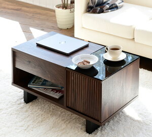 収納力と機能性が兼ね備わった天板昇降式テーブル。天板の一部を自由に昇降することができ、天板下には収納スペースを備えているためノートパソコンやリモコン、雑誌や本などを収納できます。収納スペースは天板下だけでなく、台座部分にはフルスライド...