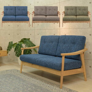 ナチュラルカラーのラバーウッド(ゴムの木)の天然木フレームとレトロデザインのファブリックシートがカジュアルな北欧やレトロな雰囲気をつくります。 素材感や築古マンション、和室にも似合います。 ベージュ、ブルー、グリーンの3色に2人掛けと3