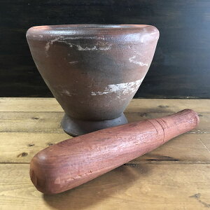 タイの有名なパパイヤサラダを作る際にもちいる ソムタムのすり鉢です。 陶器のすり鉢と棒のセットです。 サイズ:直径約8インチ 高さ約17cm 棒約29cm 材質:陶器・木材 手作りの為、多少大きさや色ムラが御座います...