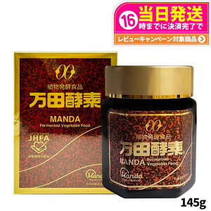 万田酵素 瓶入り 内容量 145g。万田酵素の原材料は果実類、根菜類、穀類、海藻類など、50数種を使用し、3年3カ月以上もの長期間にわたり発酵・熟成させた植物発酵食品です。