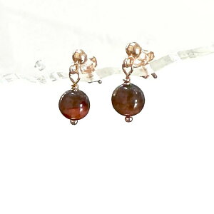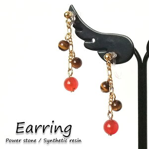 商品説明 情熱の石といわれるカーネリアン(玉髄)のオレンジレッド系のカラー石と虎の目のように輝くタイガーアイ(虎目石)を組み合わせた金属アレルギー対応の樹脂製オメガイヤリングです。 暖色系の色合いでまとめてみま