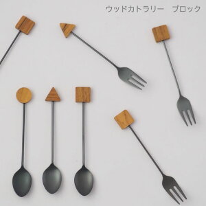 木製のパーツがアクセントのカトラリー。木のパーツに合わせて、金属部分をマットブラックに加工しています。形はマル、サンカク、シカクの3種類♪