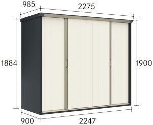 材質:特殊亜鉛鋼板にメタリック&ソリッド塗装仕上げ 屋根寸法/幅:2,275mmx奥行:985mmx高さ:2,084mm〜2,100mm 床寸法/幅:2,247mmx奥行:900mm 有効開口寸法/幅:1,017mmx高さ:1,9
