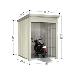バイクシャッターマン BS-1826 組立+転倒予防措置(土)付き。耐食性に優れた特殊亜鉛鋼板に高級焼付塗装。外部寸法:間口1832×奥行2622×高さ2570mm 開口部寸法:間口1618×高さ2045mm 内部寸法:間口1776×...