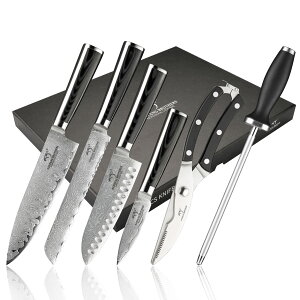 ・【包丁セット仕様】:19.2cm牛刀包丁*1、16.2cm三徳包丁*1、19.7cmパン切り包丁*1、8.2cmペティナイフ*1、キッチンハサミ*1、包丁研ぎ棒*1。・【高級包丁セット】:この包丁セットは67層VG10ダマスカス鋼を...