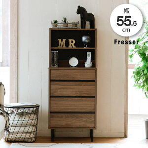 合わせがモダンな印象を与える、北欧テイストシリーズ“Fresser”。4段のチェストにオープンラックが付いたスリムチェストラック。シンプルなデザインながら、飾るもので