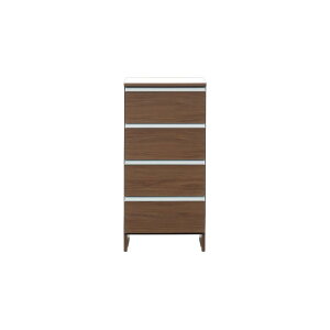4段の引き出しにたっぷり収納可能。引き出しは出し入れスムーズなスライドレール仕様。天板は水に強いポリエステル化粧板を使用。取っ手はシャープにみせるアルミ製。しっかりしたつくりの国産完成品。