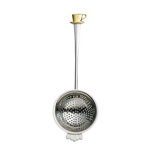 お茶会がモチーフのカトラリーシリーズ。持ち手にカップのチャームがついた茶こしです。お手入れのしやすいステンレス製。ストレーナーのしずく受けと茶殻捨てにストレーナー用の受け皿があると便利ですね。 【商品仕様】 サイズ/約15