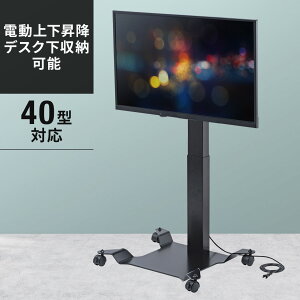 スイッチ1つで電動昇降、使わないときはデスク下収納できるキャスタータイプのディスプレイスタンド。32?40型対応。