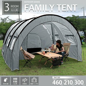 大人6人分の就寝スペース、そしてリビングスペースを備えた計3ルームテントです! 本格的就寝スペースとリビングスペースが設営でき、 グループやファミリーにおすすめの一台です。 広々としたリビングスペースにはチェアやテーブルなどを配置でき...