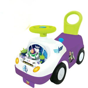 かっこいい”バズライトイヤー”の乗用玩具。足でけって遊んだり、楽しい仕掛けいっぱいで楽しめます。押手棒がついているので、押し車としても使用できます。