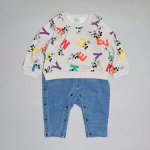 【お揃いアイテム】 カラフルなアルファベットとキャラクターの総柄がポップで元気いっぱいのロンパース★ デニム見えボトムスとのドッキングデザインで、一枚でおしゃれなお出かけコーデが完成しちゃう便利アイテム♪ 柔らかい肌ざわ
