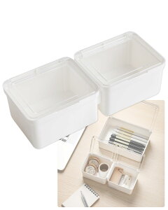 【卓上収納ボックス 3段仕切り・透明デザイン】 デスク周りの小物をすっきり分類できる透明の収納ボックス。3つの仕切り付きで文具やアクセサリーを分けて収納でき、積み重ねて使える省スペース設計です。 ▼ 透明素材の中身が見やすい