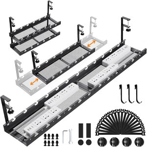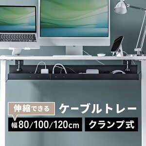 電源タップ、ケーブルを収納でき、デスクに後付ができるケーブルトレー。クランプ式で簡単取り付け。スチール製でスタイリッシュに目隠しができる。横幅を80/100/120cmの3段階に調整できる。