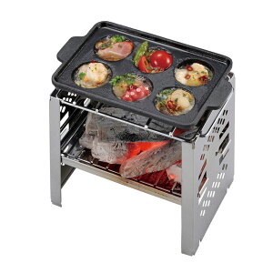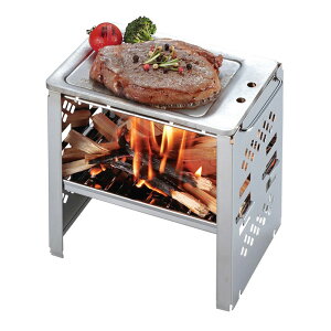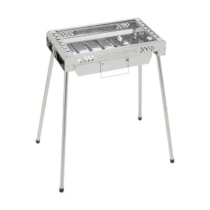 収納サイズが厚さ8cmのコンパクト設計のステンレス製グリル。 網焼きと串焼きが同時に楽しめます。 ハイ約70cm、ロー約38cmに高さ調節が可能。 差し込む穴を変えて、串の角度を2段階に調節可能。 つぎたし簡単なスライド式炭入れ。 炭入れ