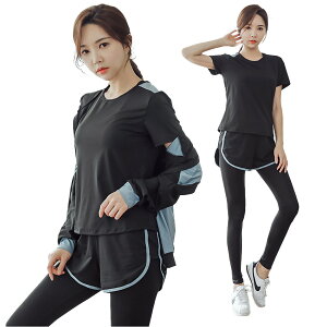 速乾性&伸縮性の高いストレッチ素材で、スポーツウェアに最適な半袖/長袖3点セット。セット内容:半袖トップス/長袖トップス、ロングパンツ、ショートパンツ。これさえあれば、近所でのジョギングはもちろん、スポーツジムやヨガスタ