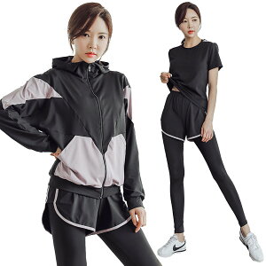 体型カバー効果あり、ゆったりパーカー付きのフィットネスウェア4点セット。これさえあれば、近所でのジョギングはもちろん、スポーツジムやヨガスタジオでもお洒落にフィットネスコーデを楽しめます。