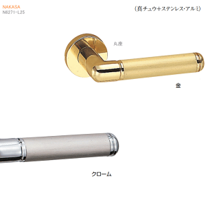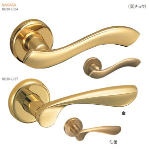 レバーハンドル 丸座 の詳細 ■デザイン:N6299-L304(レバー全長138mm) ■デザイン:N6299-L307(レバー全長120mm) ■材質:真鍮 ■仕上:(金)(仙徳) ■丸座付 ■錠タイプ:標準空錠・表示錠・間仕切錠 ...