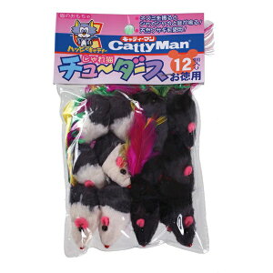つきネズミ、12個セット。振るとカシャカシャ音が鳴る羽ネズミが12個入ったチューダース。ネズミのおもちゃはウサギ毛で覆われ、その上シッポは羽。天然素材に愛猫もおおよろこび