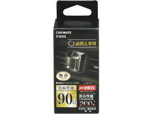 従来品比200%の消臭性能を実現。除菌消臭成分に安定化二酸化塩素を採用。悪臭成分を酸化分解し、強力除菌&消臭。コンパクトなエアコン取付タイプ。持続期間約90日間。内容量12g。D232の詰替え用。メーカー:カーメイト品番:D233