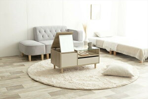 バイカラーが印象的な『Erin(エリン)』シリーズのバイカラーディスプレイ収納付きドレッサーテーブル。天板を開ければドレッサーに、閉じればソファと相性のいいセンターテーブルになる1台2