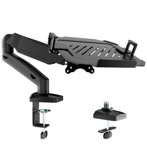 【デュアル式・トレイ付き】ガススプリングアームが二本付きで、15ー27インチのモニターを2台で同時に配置できます。そして、ノートパソコン用のトレイも付属しており、11−17インチのノートパソコンに適用します。トレイの左右には、固
