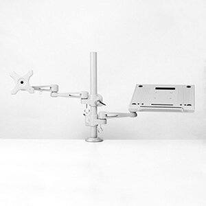 ●ノートパソコン台と27インチモニタを搭載できるモニターアームです。ノートパソコンをデスクの上に置く必要が無くスペースを広く使うことが可能になります。