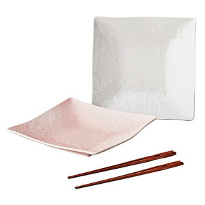 シンプルでシャープな角皿にハナミズキの柄が品よく施されています。軽くしなやかな竹箸も、ひねりのあるおしゃれなデザイン。大人の女性に使っていただきたい上品なテーブルウェアのセットです。 商品 : 角皿 (約22x22xH4cm) x 2...