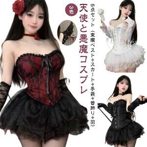 天使と悪魔コスプレ5点セット(束腰ベスト+スカート+手袋+首飾り+羽)3色【天使と悪魔 】悪魔と天使のデザイン、今すぐ友達と決めて、コントラストが映える!コスプレが初めての方も挑戦しやすい。【豪華5点フルセット】束腰ベスト+ポン