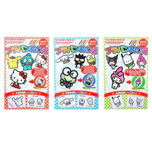 「サンリオキャラクターズ」デザインのキーホルダーが作れるセットの「プラバンぬりえ」♪ 半透明の2枚のシートには3種類のキャラクターが描かれています! 色鉛筆やペン等で自由に色を塗ろう☆彡 オーブントースターで熱を加えると約1/